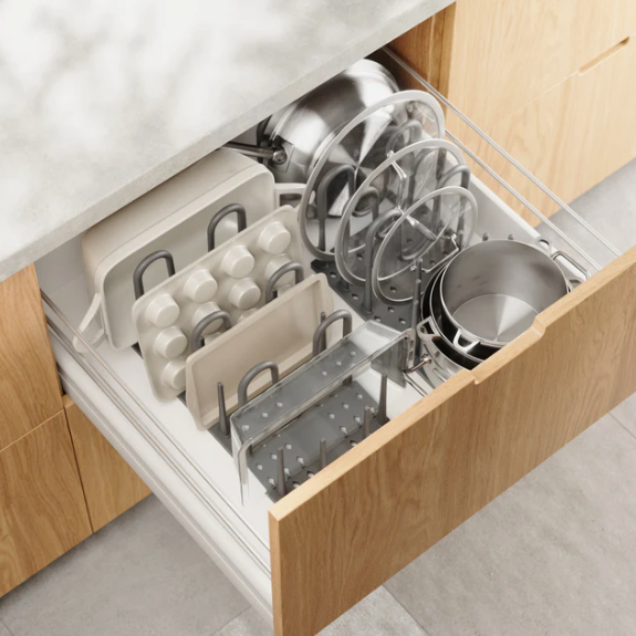 - Dapur / Dapur: Rak kawat sangat ideal — memungkinkan sirkulasi udara dan membuat tumpahan mudah dibersihkan. Tambahkan pelapis rak untuk barang-barang kecil.
